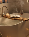 In the glow of a single candle, The Flow Board spans the tub, catching light in both the wood and the resin. A folded towel, a favourite drink and a bar of soap are all it needs to make the room feel considered instead of improvised.